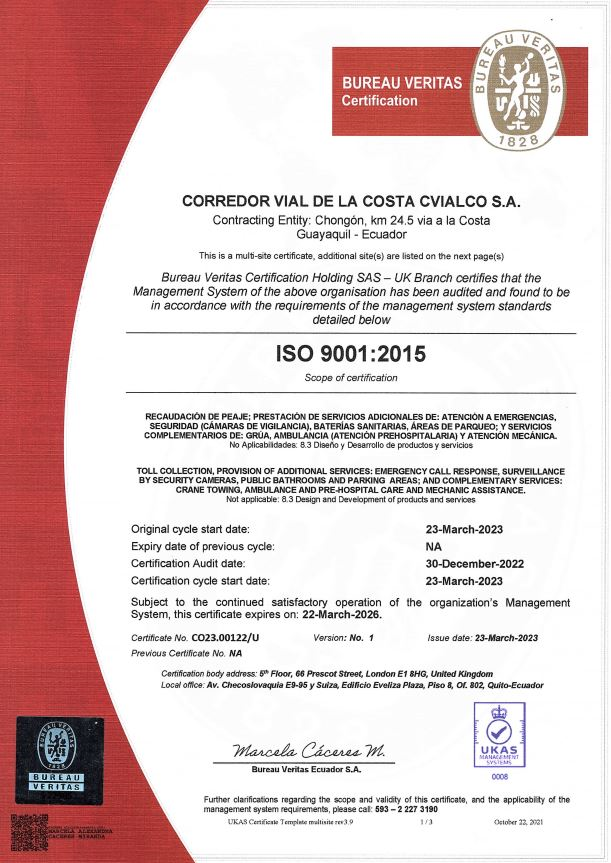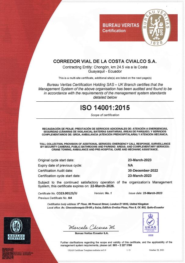 CVIALCO S.A., dedicada a la recaudación de peaje; prestación de servicios adicionales de atención a emergencias, seguridad, baterías sanitarias, áreas de parqueaderos; servicios complementarios de grúa, ambulancia y atención mecánica, en la vía delegada Chongón – Santa Elena, Progreso – Playas, implementa y mantiene un sistema de gestión basado en las normas ISO 9001:2015 e ISO 14001:2015.
